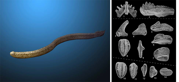Un bel conodonte a fianco dei buffi dentini che li caratterizzavano. Image credit: Nobu Tamura, CC-BY-SA-4.0 / GDK, CC-PD-Mark